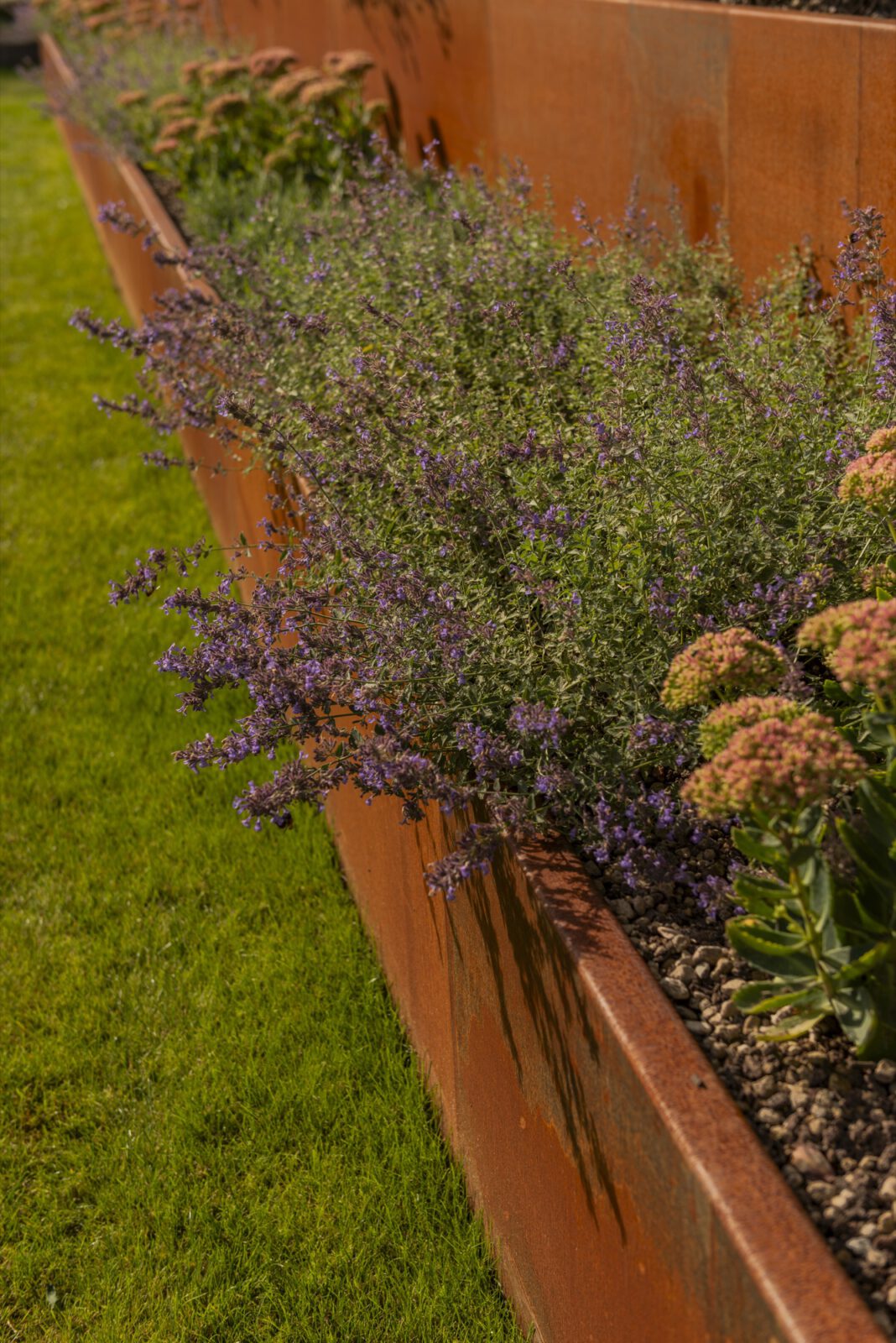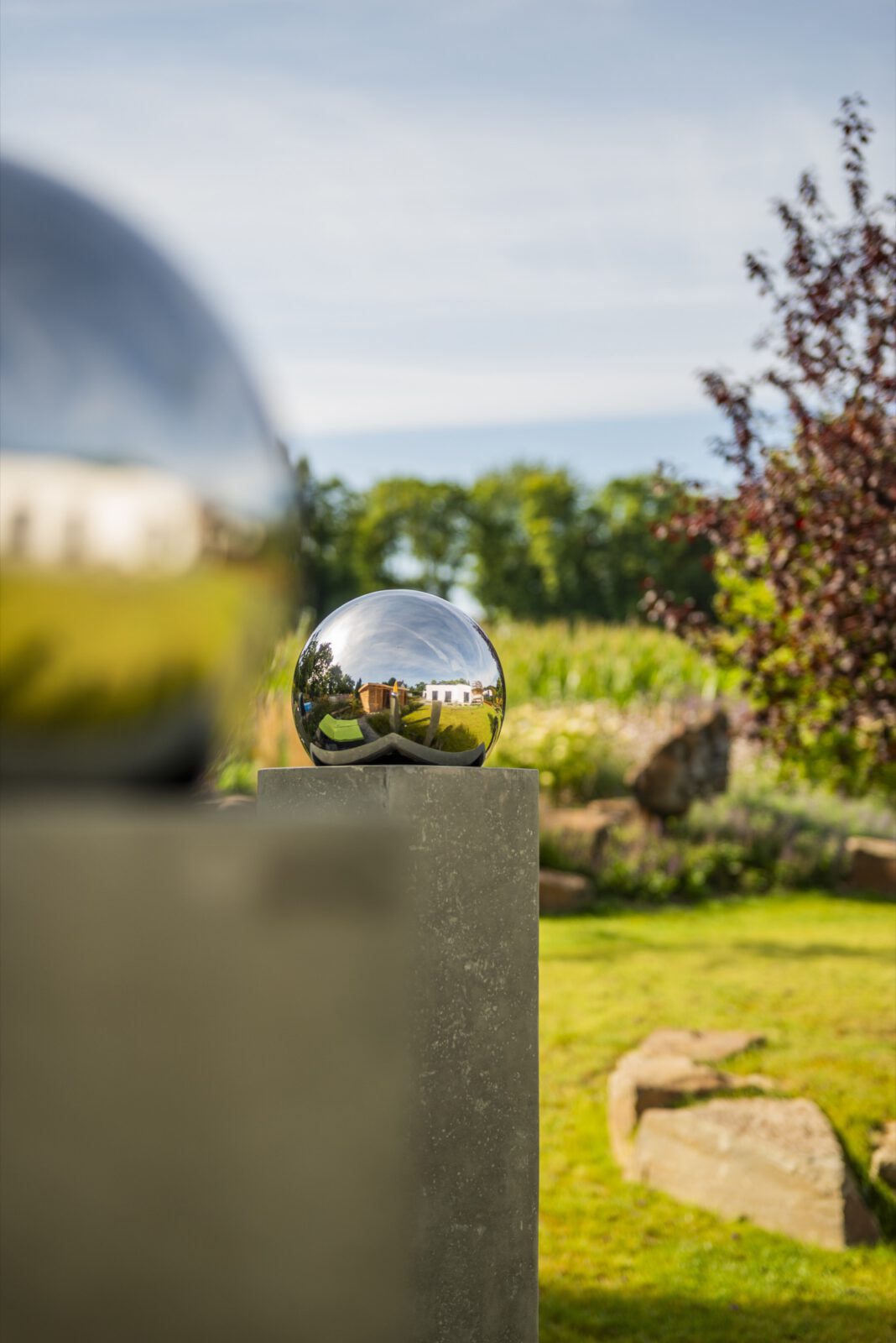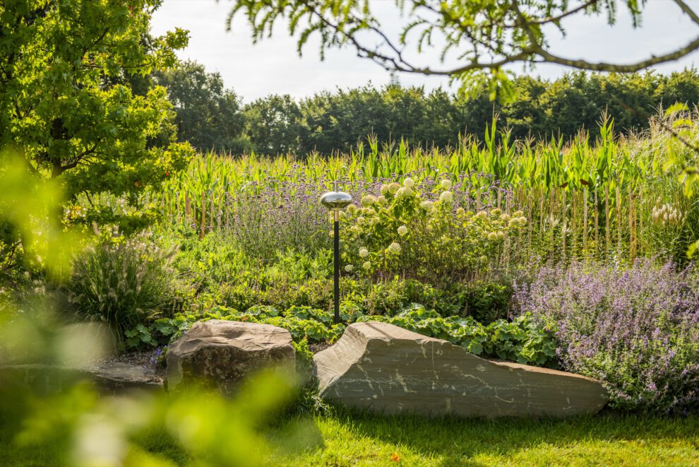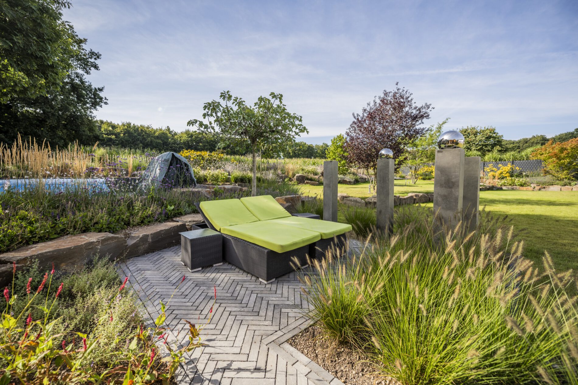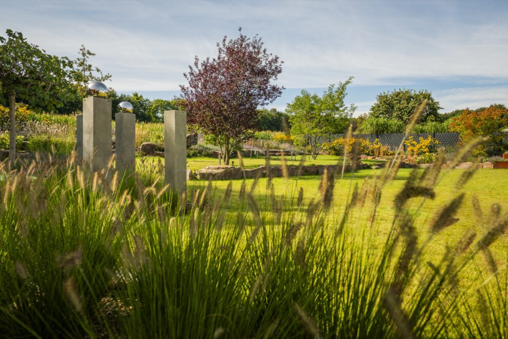 Als ruhigen, grafischen Gegenpol haben wir drei schlanke Steinstelen mit polierten Chromkugeln gesetzt – sie fangen das Licht ein und spiegeln die umliegenden Gräser. Ein ähnliches Spiel mit Reflektion und Kontrast übernimmt die Cortenstahl-Einfassung am Hauptbeet: Die rostrote Patina korrespondiert mit dem warmen Braun des Sandsteins, während die Katzenminze in Wolken über die Kante fließt. So wird dieser naturnahe Garten an keiner Stelle „wild im Sinne von ungepflegt” – sondern bewusst gestaltet, nur eben mit einem anderen Ordnungsprinzip als der klassische Ziergarten.