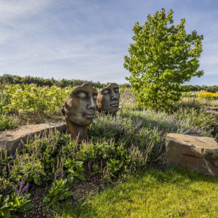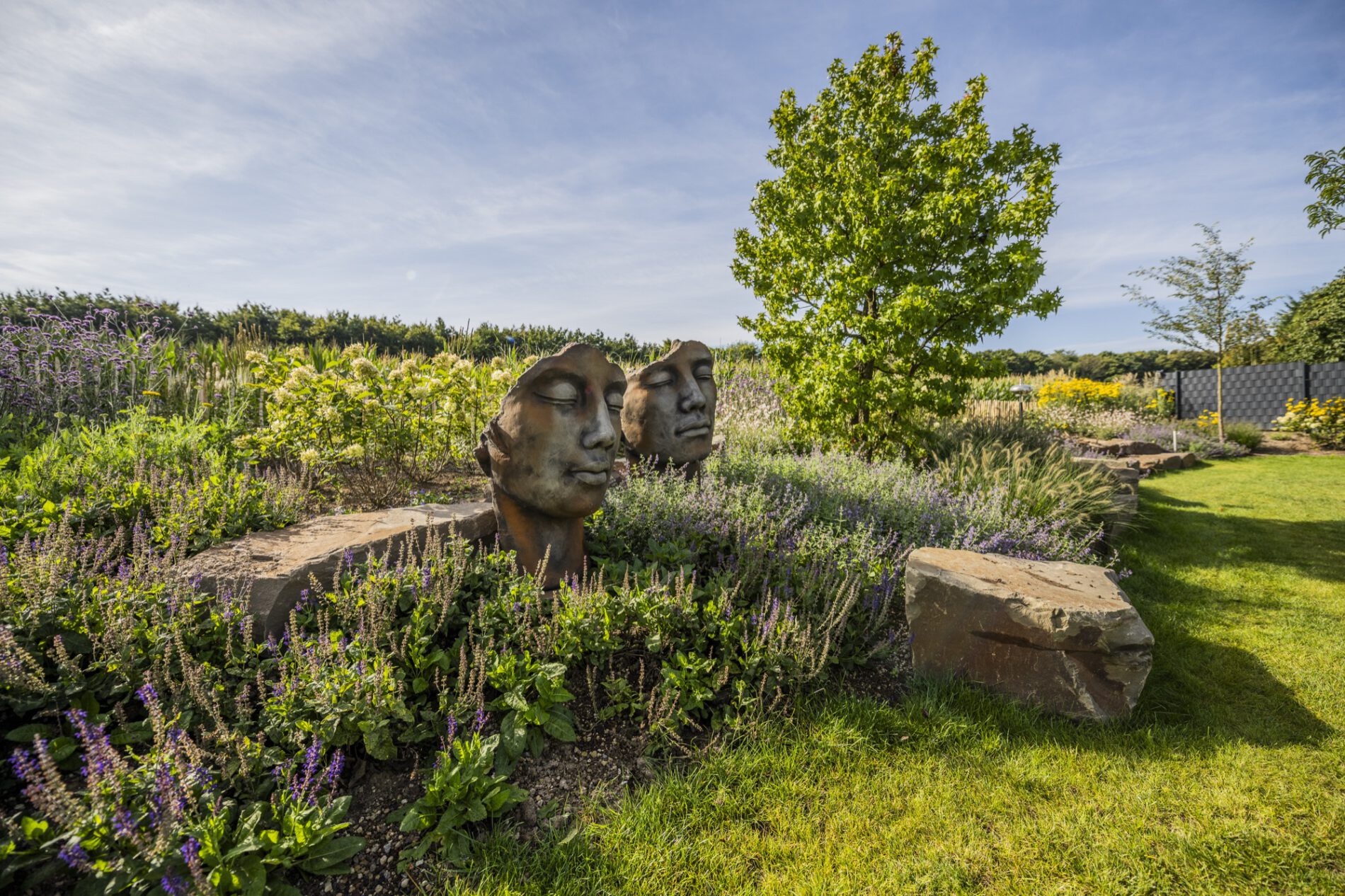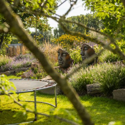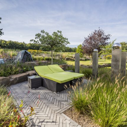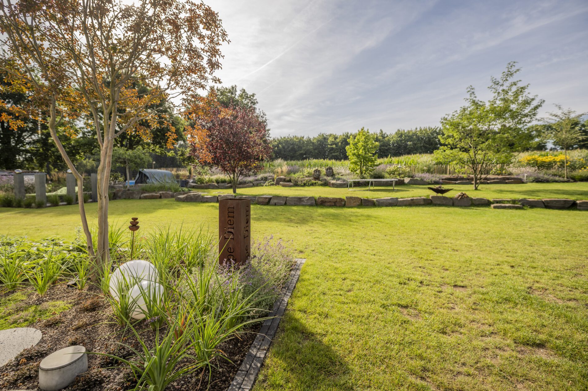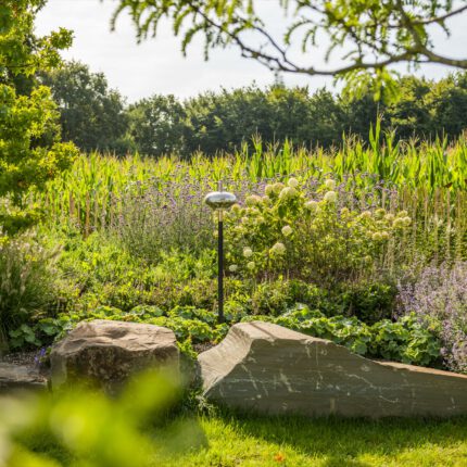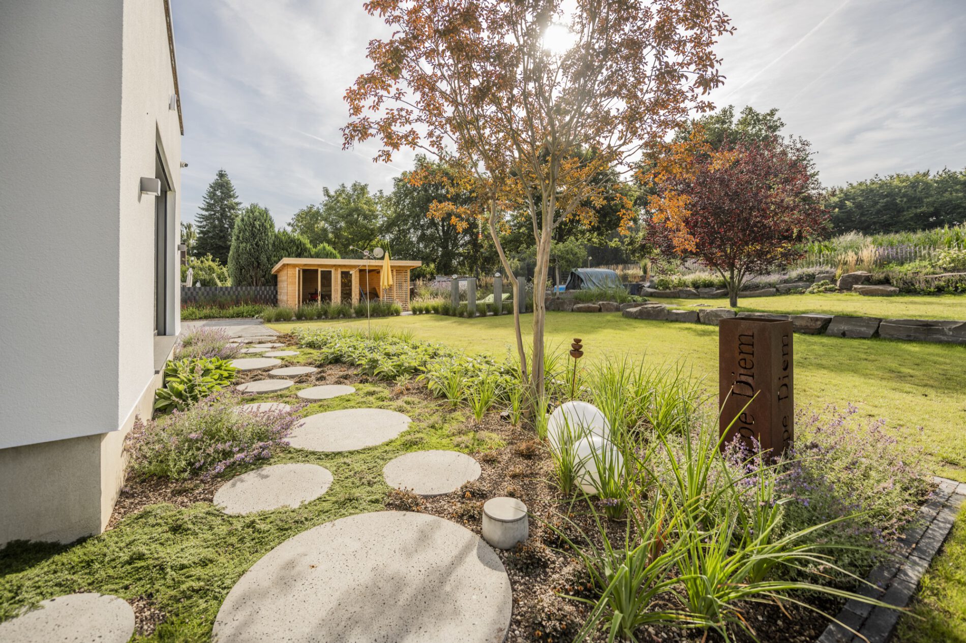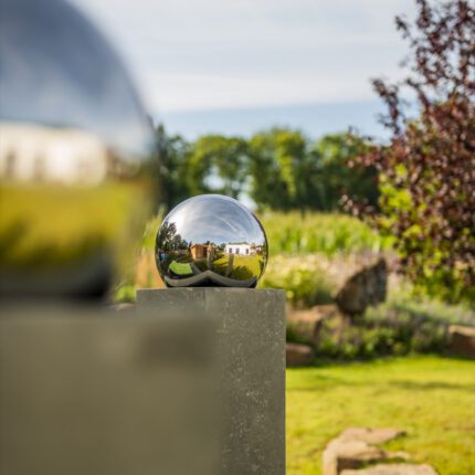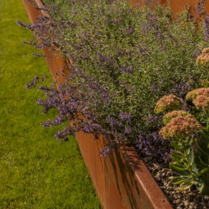 Als ruhigen, grafischen Gegenpol haben wir drei schlanke Steinstelen mit polierten Chromkugeln gesetzt – sie fangen das Licht ein und spiegeln die umliegenden Gräser. Ein ähnliches Spiel mit Reflektion und Kontrast übernimmt die Cortenstahl-Einfassung am Hauptbeet: Die rostrote Patina korrespondiert mit dem warmen Braun des Sandsteins, während die Katzenminze in Wolken über die Kante fließt. So wird dieser naturnahe Garten an keiner Stelle „wild im Sinne von ungepflegt” – sondern bewusst gestaltet, nur eben mit einem anderen Ordnungsprinzip als der klassische Ziergarten.