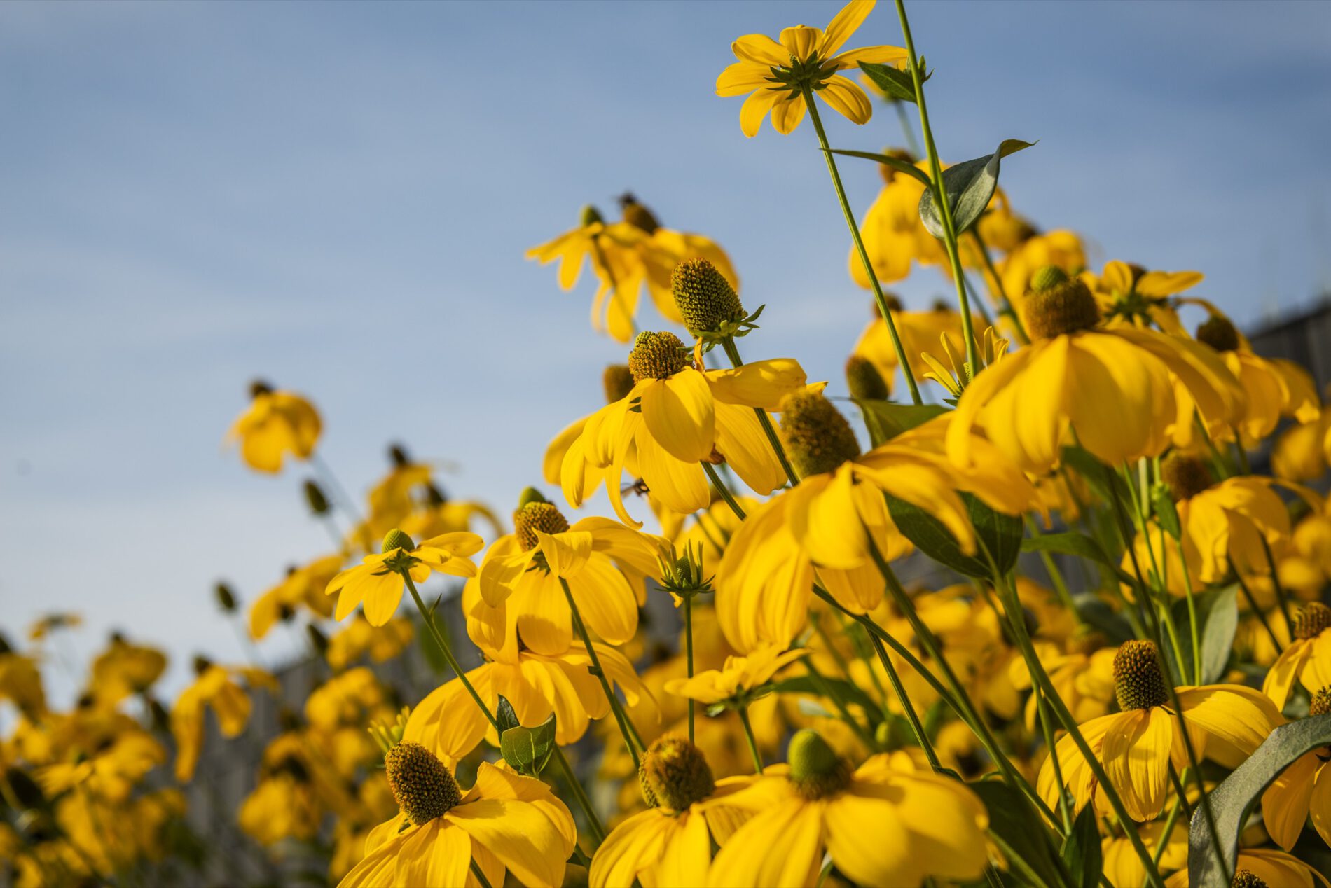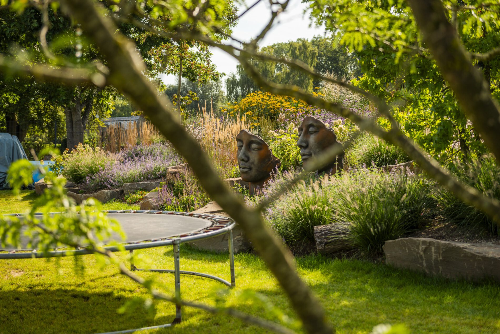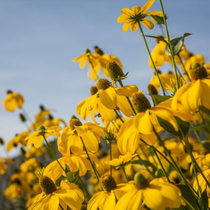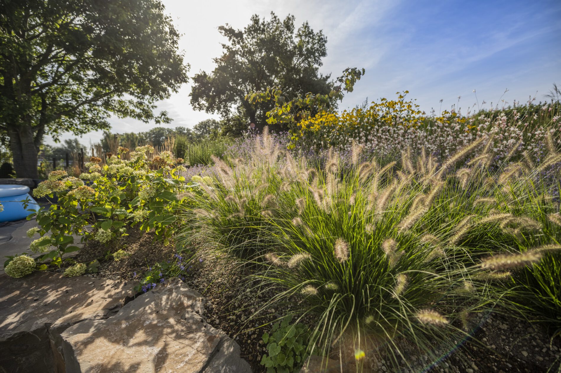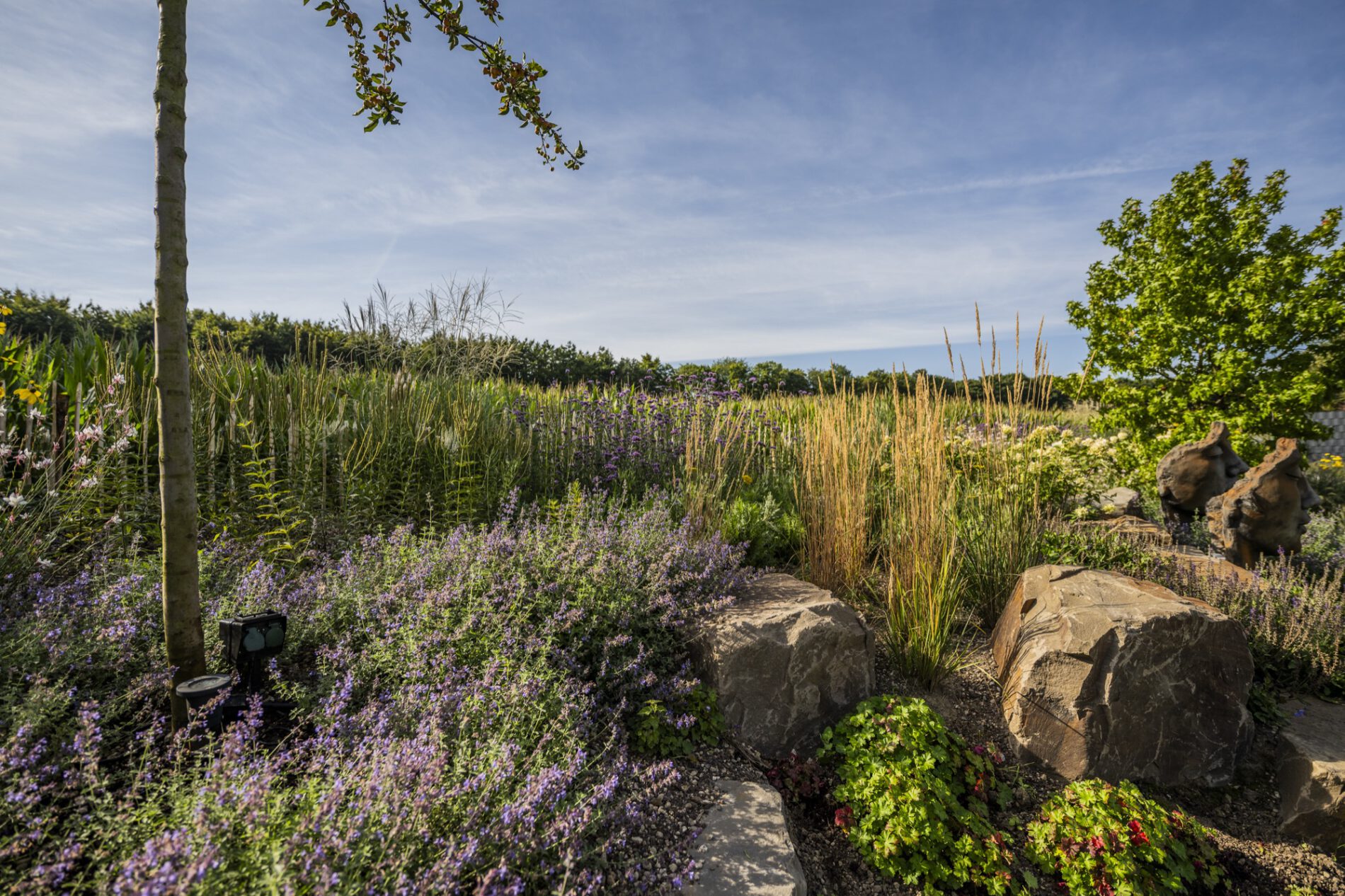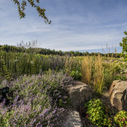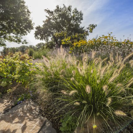 Die Pflanzung folgt dem Prinzip des „New German Style”: langlebige Stauden in Verbindung mit strukturgebenden Ziergräsern, kombiniert zu einer Matrix, die sich über die Jahre selbst trägt. In den tieferen Ebenen arbeiten wir mit Katzenminze, Frauenmantel, Fetthenne ‘Autumn Joy’ und Thymian als Fugenpflanzung. Die mittlere Ebene gestalten Lampenputzergras, Purpurglöckchen, Rispenhortensie ‘Annabelle’ und niedrige Gaura. Die hohe Strukturebene übernehmen Reitgras ‘Karl Foerster’, Argentinisches Eisenkraut und der gelbe Sonnenhut Rudbeckia nitida ‘Herbstsonne’ – sie verleihen dem naturnahen Garten im Spätsommer seine unverwechselbare Licht- und Farbstimmung.