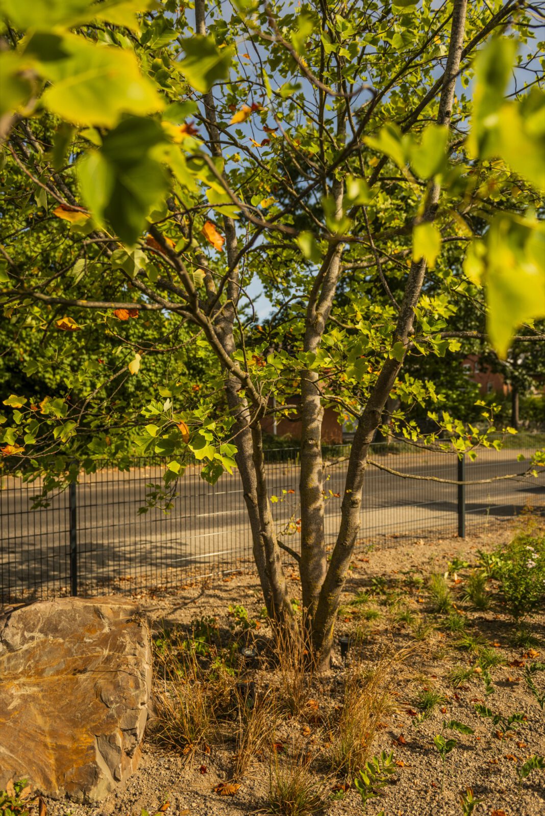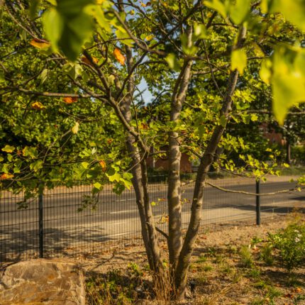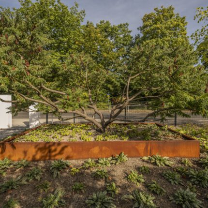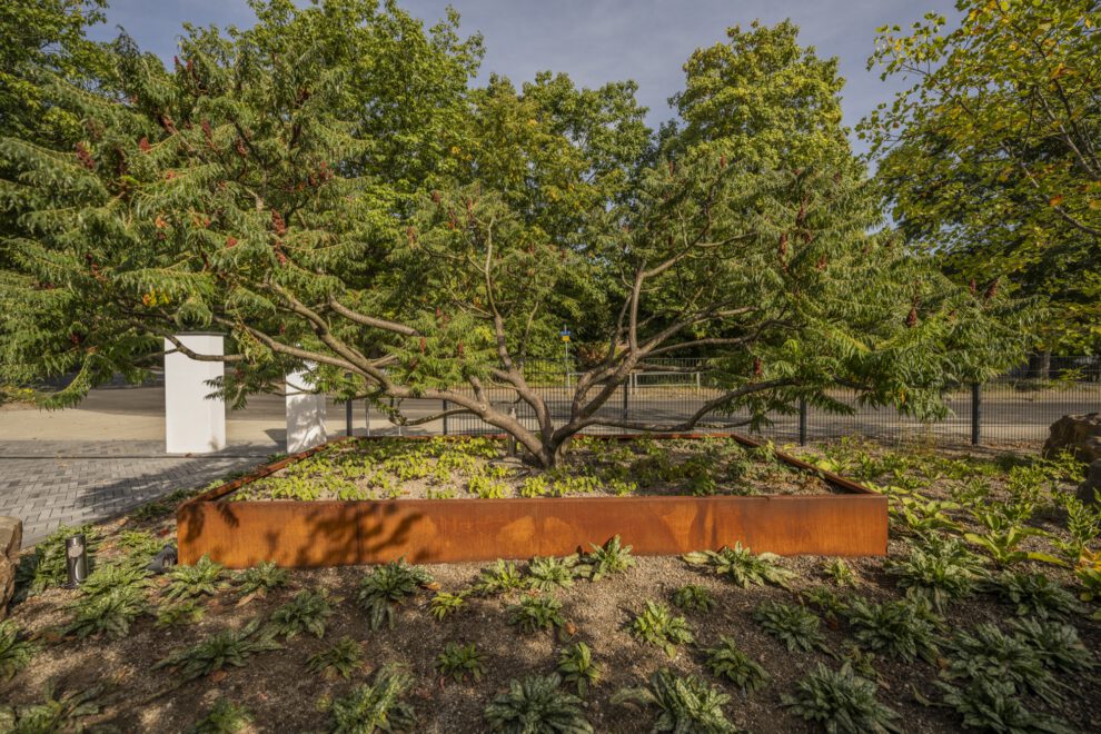 Ergänzt wird die Staudenprärie durch eine sorgfältig gesetzte Gehölz-Kulisse: eine Blutpflaume als dunkler Akzent am Haus, ein mehrstämmiger Essigbaum im Cortenstahl-Pflanzgefäß, ein Amberbaum für die Herbstfärbung und ein Tulpenbaum zur Straßenseite. Jede dieser Pflanzen übernimmt eine konkrete Rolle in der Jahreszeitendramaturgie – sodass es vom ersten Frauenmantel im Mai bis zu den Samenständen im Januar immer etwas zu sehen gibt.