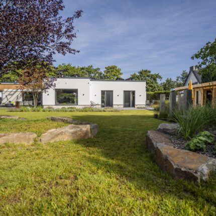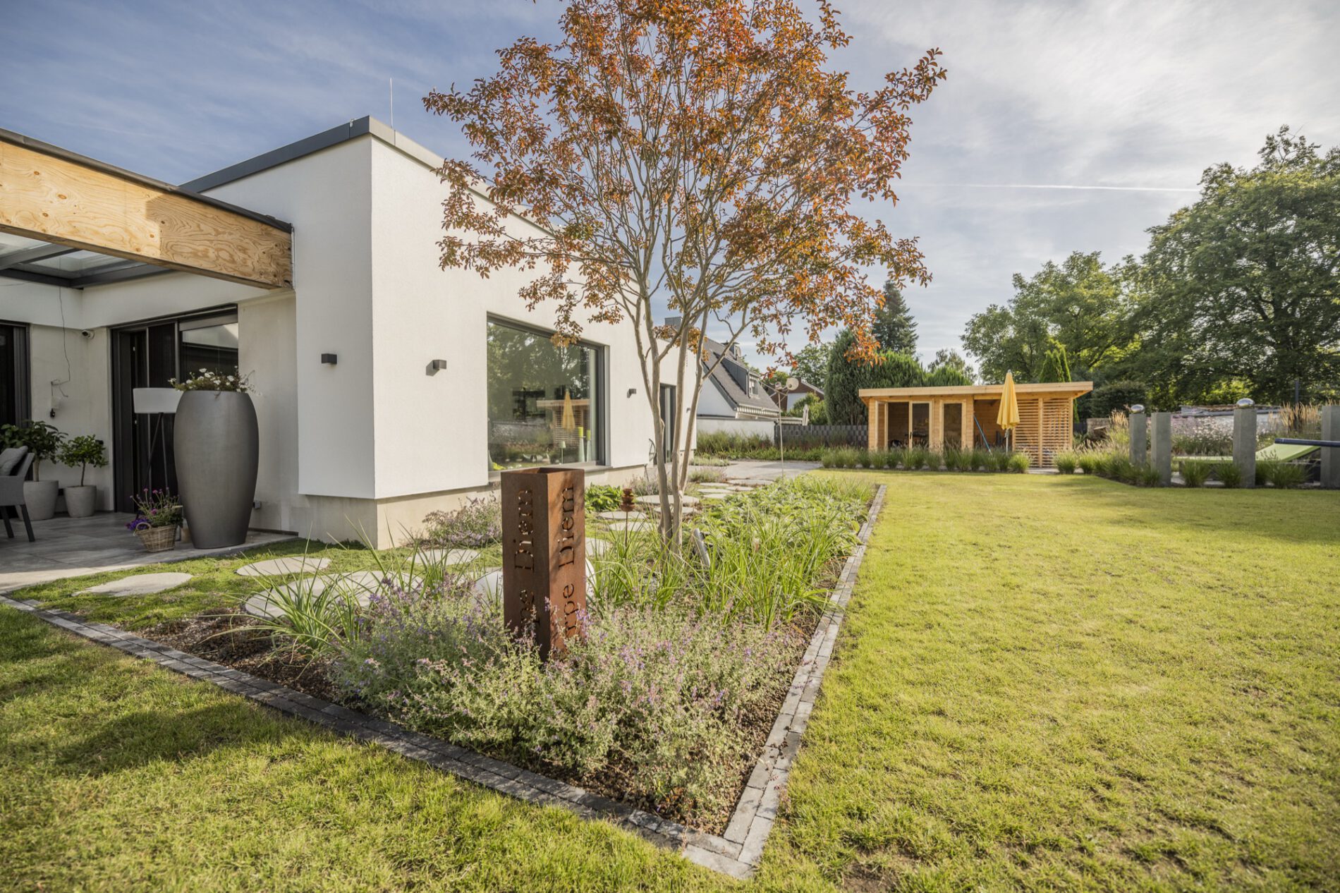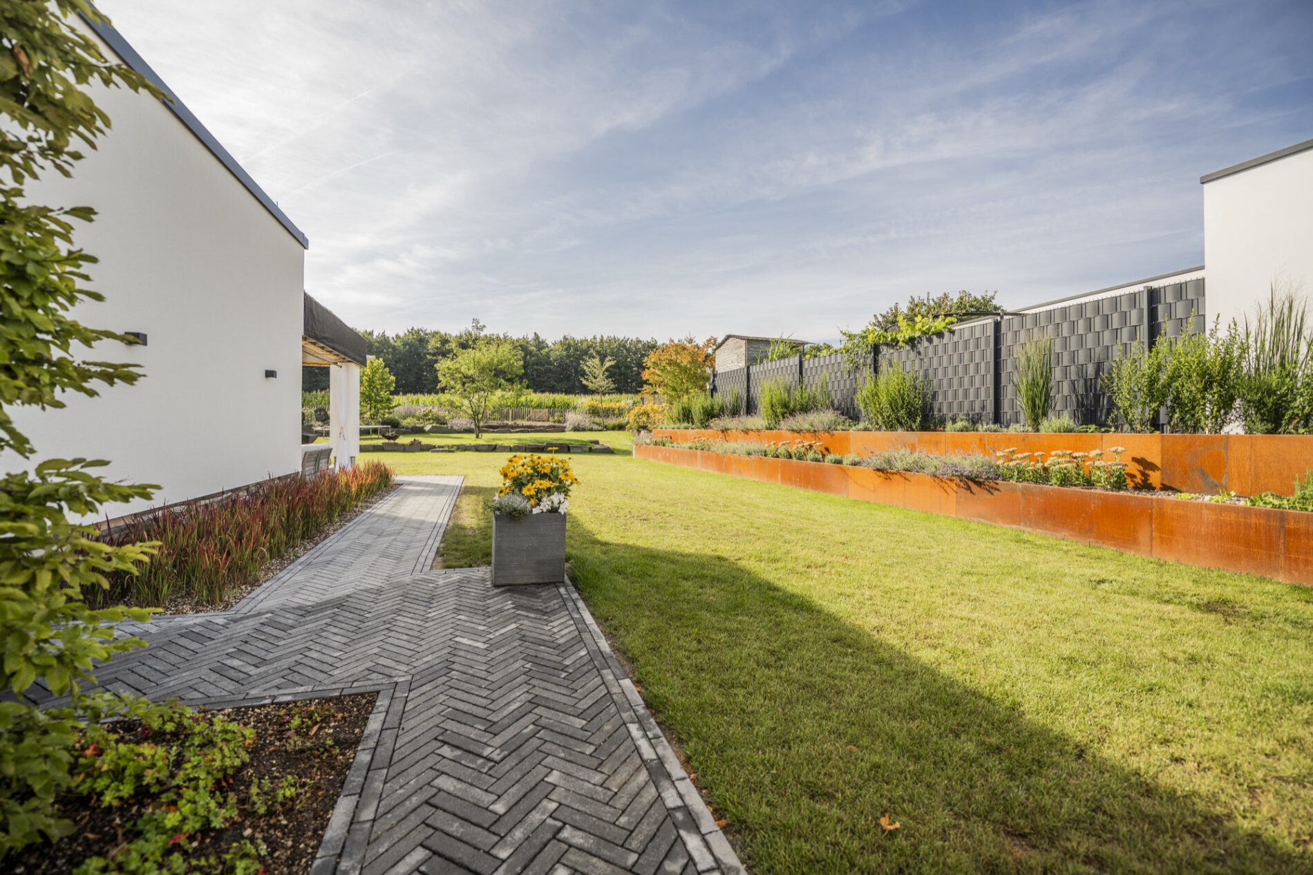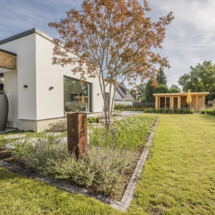 Ein reduzierter weißer Kubusbau mit Flachdach, eine überdachte Loggia, ein ruhiges Grundstück am Rand der offenen Feldflur – die Architektur dieses Hauses spricht eine klare, zeitgenössische Sprache. Unsere Bauherrschaft wünschte sich dazu einen Garten, der nicht noch eine zweite, strenge Ebene draufsetzt, sondern bewusst das Gegenteil anbietet: ein naturnaher Garten mit Staudenprärie, Trockenmauer aus Sandstein und Cortenstahl-Hochbeeten. Entstanden ist ein Ort, an dem sich Familie, Kinder, Insekten und Jahreszeiten gleichermaßen wohlfühlen – und der trotz seiner Größe nie überladen wirkt.
