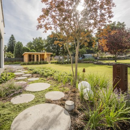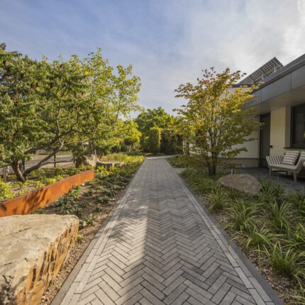 Der Entwurf gliedert das Grundstück in drei miteinander verwobene Zonen: den architektonischen Vorplatz mit Fischgrät-Pflaster und Cortenstahl-Hochbeeten, die familiengerechte Rasenfläche als ruhige Mitte, und die Staudenprärie entlang der Ränder. Zwischen diesen Zonen vermitteln Sandstein-Trockenmauern, die wir aus regionalen Bruchsteinen aufgeschichtet haben – mit den unregelmäßigen Fugen, die für einen naturnahen Garten entscheidend sind: dort nisten Wildbienen, dort wachsen Mauerpfeffer und Frauenmantel in die Ritzen hinein, dort verschwindet die Eidechse an warmen Tagen.