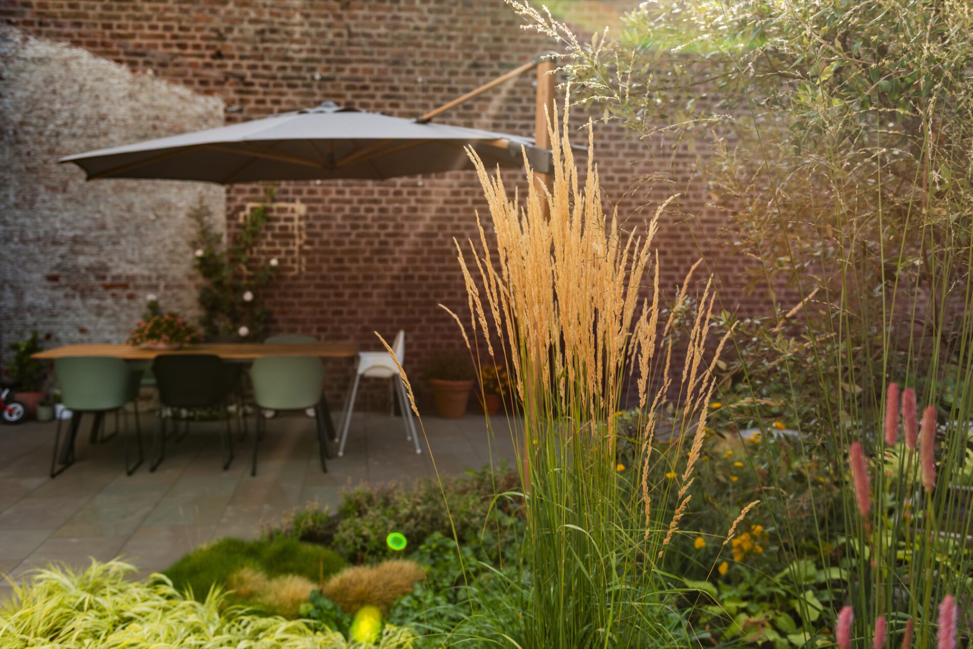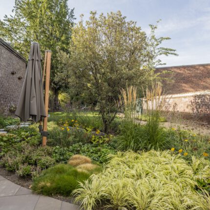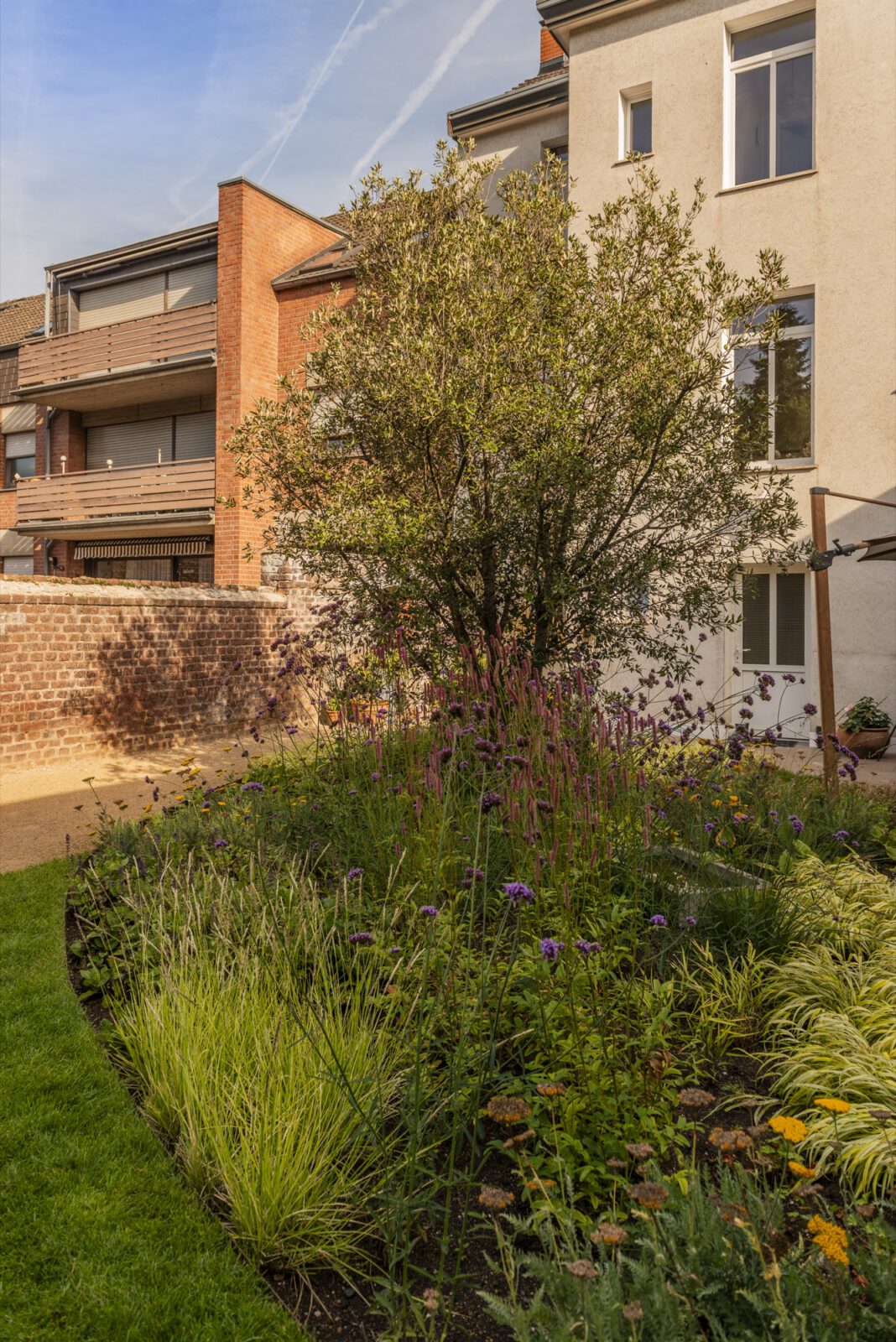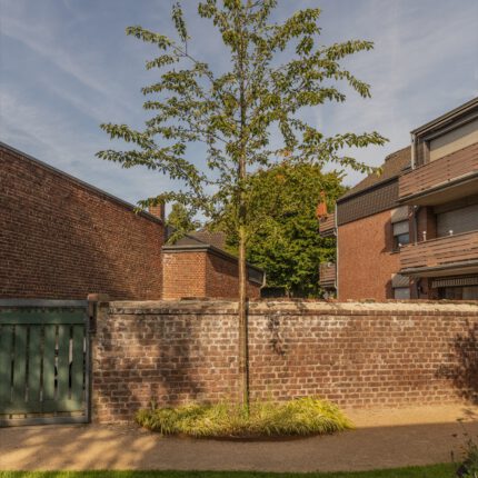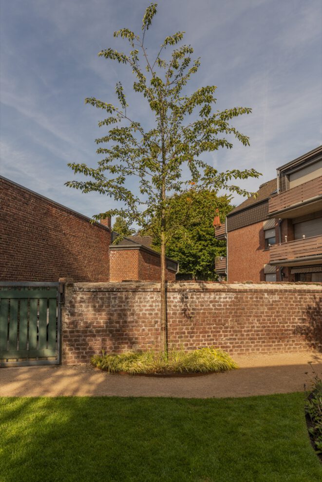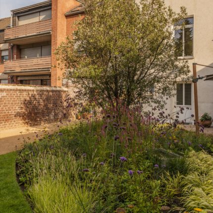 In die Staudenmatrix eingewoben sind Klassiker wie Frauenmantel, Purpurglöckchen, Funkien und Woll-Ziest, dazu höhere Akteure für den Sommer und Herbst: Schafgarbe ‘Terracotta’, Argentinisches Eisenkraut, Kerzenknöterich in Rosa und Rot, Wiesenknopf und Reitgras ‘Karl Foerster’. Als skulpturaler Blickfang wurde ein mehrstämmiger Wildölbaum gesetzt – er bringt südländisches Flair in den niederrheinischen Hinterhof, wirkt aber durch seine zurückhaltende Farbigkeit nie aufdringlich. Eine junge Vogelkirsche im Vorgarten schließt den Kreis – und beweist, dass man auch auf kleinem Raum mit Bedacht pflanzen kann.