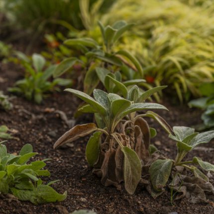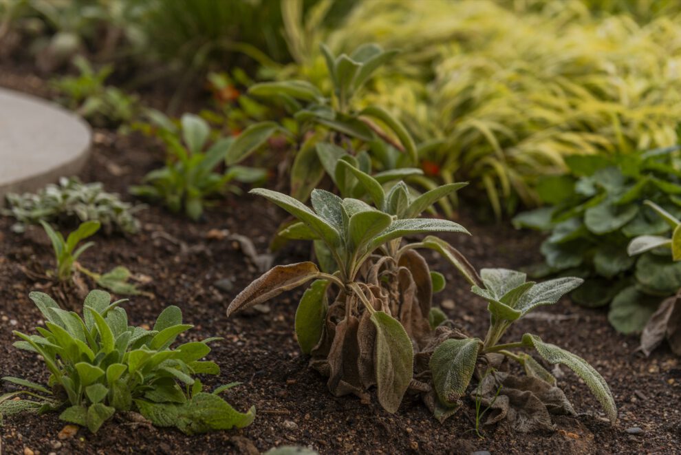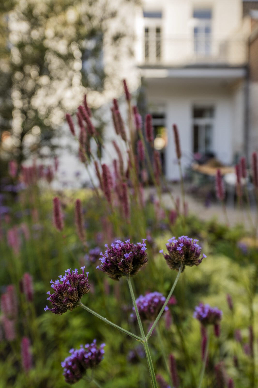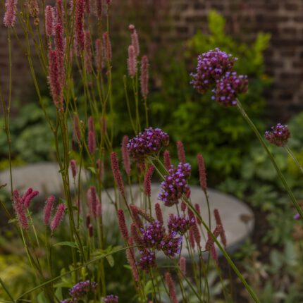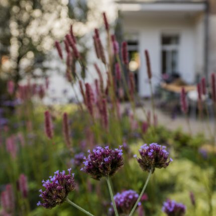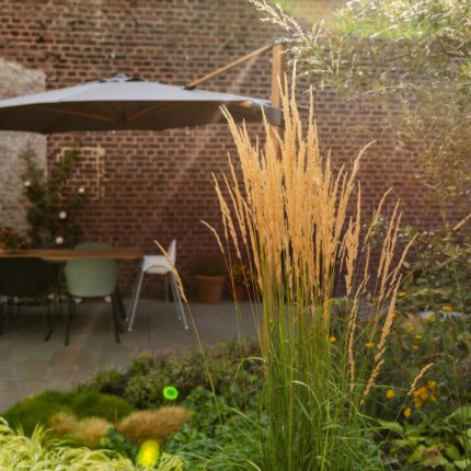 In die Staudenmatrix eingewoben sind Klassiker wie Frauenmantel, Purpurglöckchen, Funkien und Woll-Ziest, dazu höhere Akteure für den Sommer und Herbst: Schafgarbe ‘Terracotta’, Argentinisches Eisenkraut, Kerzenknöterich in Rosa und Rot, Wiesenknopf und Reitgras ‘Karl Foerster’. Als skulpturaler Blickfang wurde ein mehrstämmiger Wildölbaum gesetzt – er bringt südländisches Flair in den niederrheinischen Hinterhof, wirkt aber durch seine zurückhaltende Farbigkeit nie aufdringlich. Eine junge Vogelkirsche im Vorgarten schließt den Kreis – und beweist, dass man auch auf kleinem Raum mit Bedacht pflanzen kann.