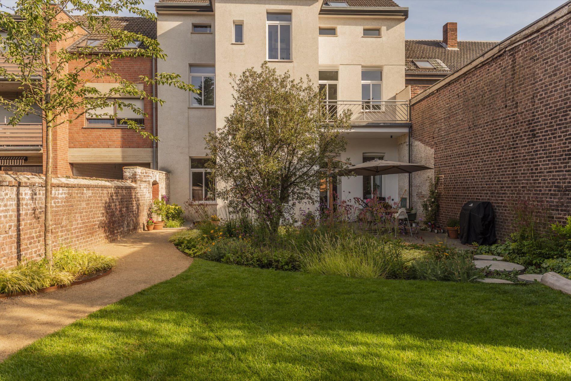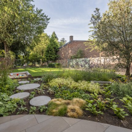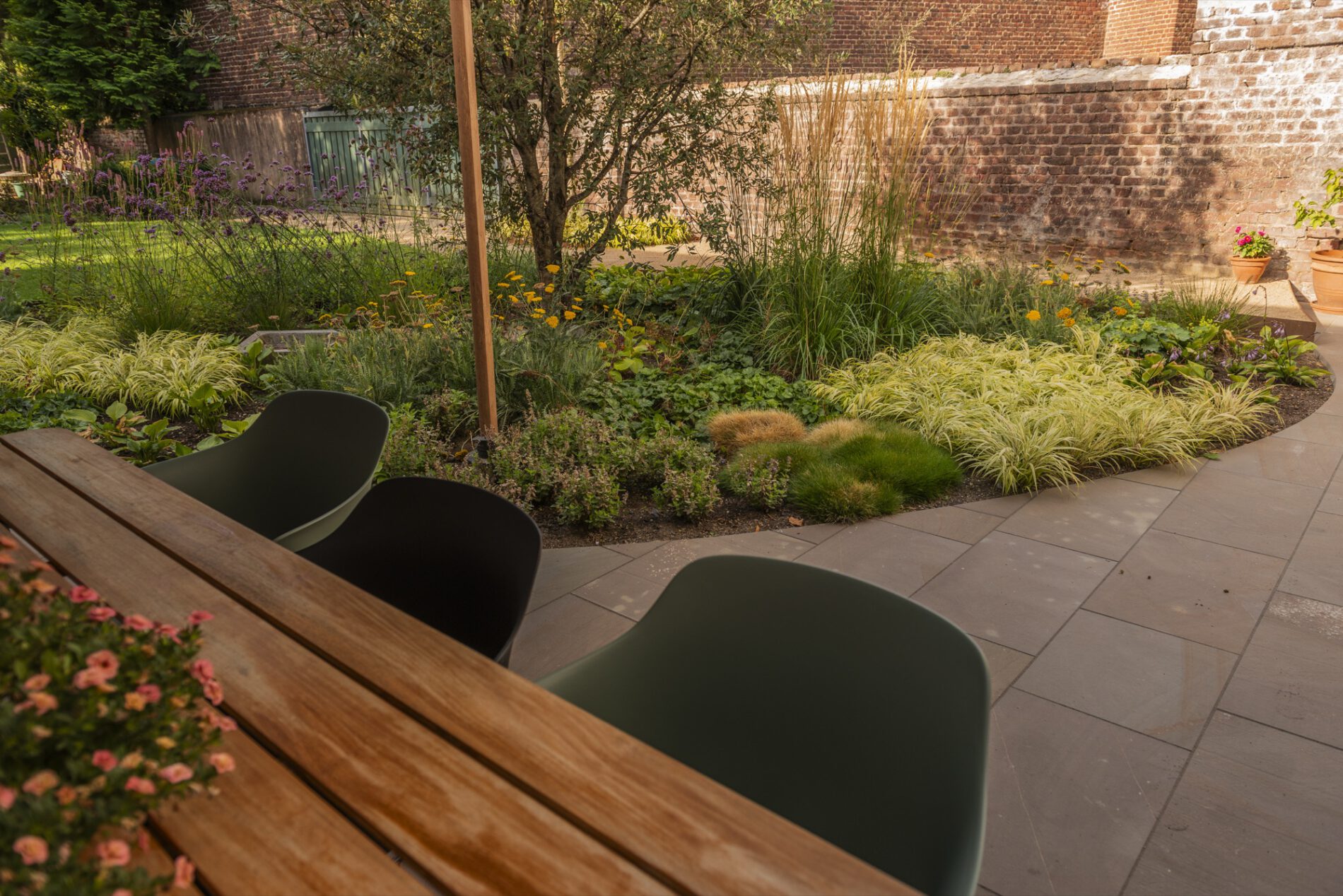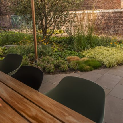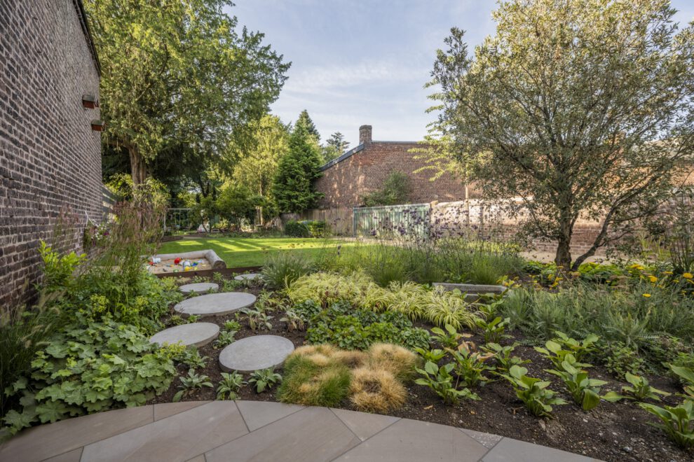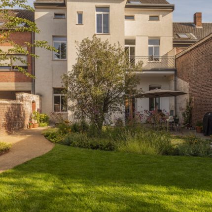 Eine präzise Abfolge von großformatigen, runden Betontrittsteinen durchzieht die Staudenbeete wie hingetupfte Inseln und zitiert dabei die alten Mühlsteine, die man in niederrheinischen Klöstern findet. Ein Cortenstahl-Sandkasten für die Kinder wurde in die Pflanzung integriert, sodass er später – wenn die Kinder größer sind – spielend leicht zu einem Hochbeet umgenutzt werden kann. Dieses Denken in Lebensphasen ist für uns Teil der Antwort auf die Frage, wie man heute einen Stadtgarten gestalten sollte: flexibel, nutzbar über Jahrzehnte, aber zu jedem Zeitpunkt gestalterisch stimmig.