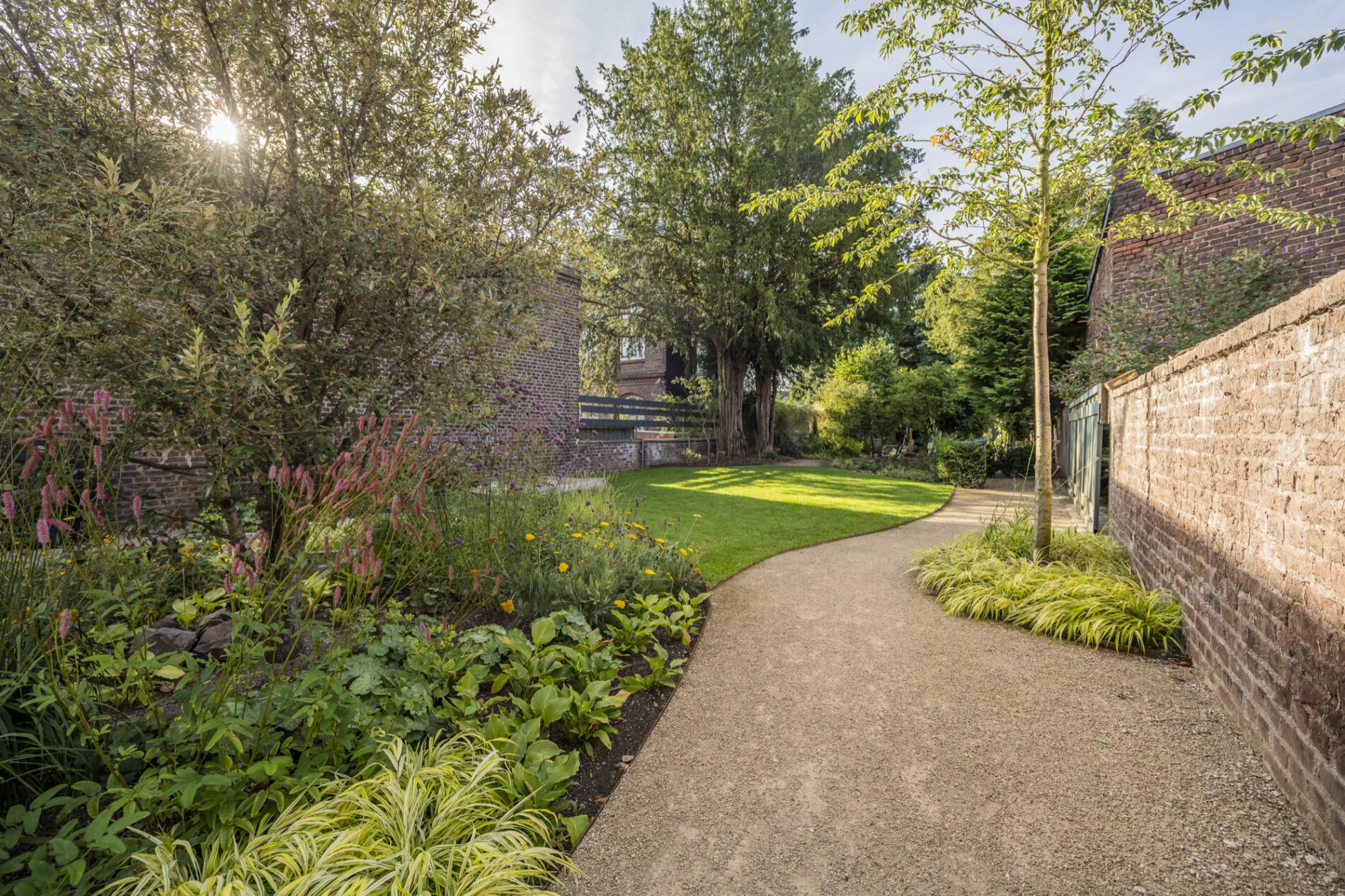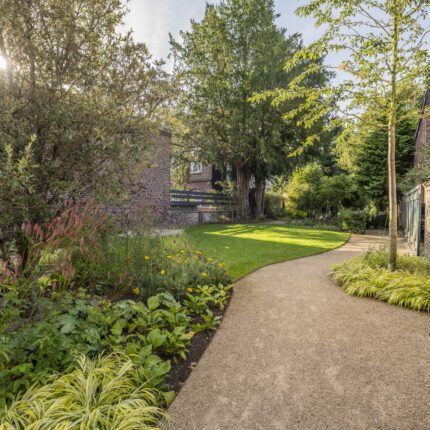 Der Reiz dieses Grundstücks lag von Anfang an im Vorhandenen: die ehrwürdigen Backsteinmauern mit ihrer Patina, die beiden alten Eiben, der Altbau selbst. Unser Entwurf hat diese Elemente nicht überformt, sondern sorgfältig inszeniert. Die geschwungene Sandsteinterrasse legt sich wie eine moderne Bühne vor das Haus, der wassergebundene Kiesweg führt in sanfter S-Linie durch den Garten – beides bewusst zurückhaltende Materialien, die der Backsteinwand die Hauptrolle lassen.